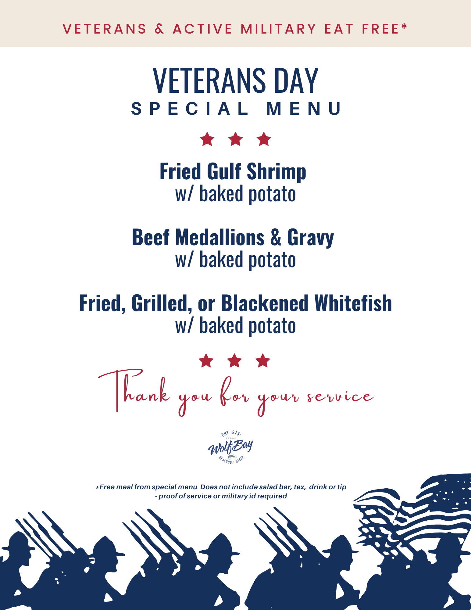 Veterans & ACTIVE Military EAT FREE* at Wolf Bay on Veterans Day